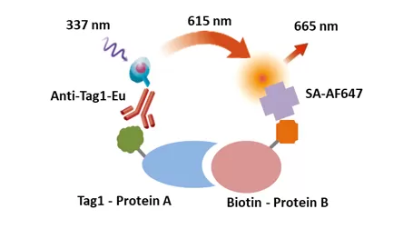 Neubo TR-FRET Streptavidin-AF647为客户提供开发TR-FRET实验工具。TR-FRET Streptavidin-AF647是在Streptavidin上面标记了荧光染料AF647,与标记有生物素的蛋白质B结合,作为受体。接受外界337nM的光照,与Tag1标记的蛋白质A结合的供体分子激发出615nM的光,把能量传递给与生物素标记的蛋白质B结合的受体Streptavidin-AF647,受体激发出665nM的光,光强度与蛋白质A和蛋白质B间的结合程度成正比。产品具有信号稳定,均相免洗,适用于高通量等特点。