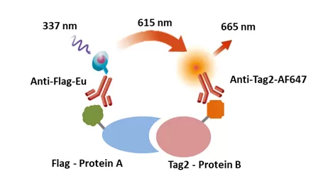 Neubo TR-FRET Anti-Flag-Eu为客户提供开发TR-FRET实验工具。TR-FRET Anti-Flag-Eu是在Anti-Flag上面标记了镧系金属Eu,与标记有Flag的蛋白质A结合,作为供体,接受外界337nM的光照,激发出615nM的光,把能量传递给与Tag2标记的蛋白质B结合的受体Anti-Tag2-AF647或其它发光分子,受体激发出665nM的光,光强度与蛋白质A和蛋白质B间的结合程度成正比。产品具有信号稳定,均相免洗,适用于高通量等特点。