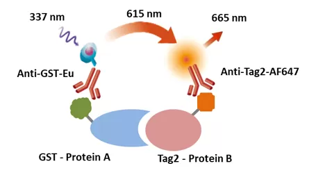 Neubo TR-FRET Anti-GST-Eu为客户提供开发TR-FRET实验工具。TR-FRET Anti-GST-Eu是在Anti-GST上面标记了镧系金属Eu,与标记有GST的蛋白质A结合,作为供体,接受外界337nM的光照,激发出615nM的光,把能量传递给与Tag2标记的蛋白质B结合的受体Anti-Tag2-AF647或其它发光分子,受体激发出665nM的光,光强度与蛋白质A和蛋白质B间的结合程度成正比。产品具有信号稳定,均相免洗,适用于高通量等特点。