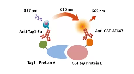 Neubo TR-FRET Anti-GST-AF647为客户提供开发TR-FRET实验工具。TR-FRET Anti-GST-AF647是在Anti-GST上面标记了荧光染料AF647,与标记有GST tag的蛋白质B结合,作为受体。接受外界337nM的光照,与Tag1标记的蛋白质A结合的供体分子激发出615nM的光,把能量传递给与GST tag标记的蛋白质B结合的受体Anti-GST-AF647,受体激发出665nM的光,光强度与蛋白质A和蛋白质B间的结合程度成正比。产品具有信号稳定,均相免洗,适用于高通量等特点。